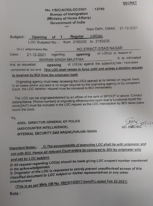 ਬਿਕਰਮ ਮਜੀਠੀਆ ਦੇ ਵਿਦੇਸ਼ ਜਾਣ ਦੀਆਂ ਅਟਕਲਾਂ ਦਰਮਿਆਨ ਇਮੀਗ੍ਰੇਸ਼ਨ ਬਿਊਰੋ ਨੇ ਐਲਓਸੀ ਜਾਰੀ ਕਰ ਦਿੱਤੀ ਹੈ। ਯਾਨੀ ਕਿ ਹੁਣ ਮਜੀਠੀਆ ਦੇ ਦੇਸ਼ ਤੋਂ ਬਾਹਰ ਜਾਣ ‘ਤੇ ਨਜ਼ਰ ਰੱਖੀ ਜਾਵੇਗੀ। ਮਜੀਠੀਆ ਹੁਣ ਦੇਸ਼ ਨਹੀਂ ਛੱਡ ਸਕਣਗੇ ਅਤੇ ਇਸ ਸੰਬੰਧੀ ਹਵਾਈ ਅੱਡਿਆਂ ਉੱਪਰ ਹੁਣ ਖਾਸ ਨਜ਼ਰ ਰਹੇਗੀ।