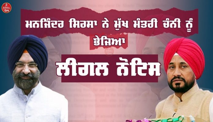 ਚੰਡੀਗੜ੍ਹ, 26 ਦਸੰਬਰ 2021 – ਭਾਜਪਾ ਦੇ ਸਿੱਖ ਆਗੂ ਮਨਜਿੰਦਰ ਸਿੰਘ ਸਿਰਸਾ ਨੇ ਪੰਜਾਬ ਦੇ ਮੁੱਖ ਮੰਤਰੀ ਚਰਨਜੀਤ ਸਿੰਘ ਚੰਨੀ ਨੁੰ ਦਿੱਲੀ ਦੇ ਮੁੱਖ ਮੰਤਰੀ ਅਰਵਿੰਦ ਕੇਜਰੀਵਾਲ ਵੱਲੋਂ ਅਕਾਲੀ ਆਗੂ ਬਿਕਰਮ ਸਿੰਘ ਮਜੀਠੀਆ ਤੋਂ ਮੰਗੀ ਮੁਆਫੀ ਦੇ ਸੰਬੰਧ ਵਿਚ ਝੁਠੇ ਤੇ ਆਧਾਰਹੀਣ ਦਾਅਵੇ ਕਰਨ ਲਈ ਲੀਗਲ ਨੋਟਿਸ ਭੇਜਿਆ ਹੈ ਅਤੇ ਉਹਨਾਂ ਨੁੰ ਤਿੰਨ ਦਿਨਾਂ ਦੇ ਅੰਦਰ ਅੰਦਰ ਲਿਖਤੀ ਮੁਆਫੀ ਮੰਗਣ ਜਾਂ ਫਿਰ ਦੀਵਾਨੀ ਤੇ ਫੌਜਦਾਰੀ ਦੋਹਾਂ ਕੇਸਾਂ ਦਾ ਸਾਹਮਣਾ ਕਰਨ ਲਈ ਤਿਆਰ ਰਹਿਣ ਵਾਸਤੇ ਕਿਹਾ ਹੈ।