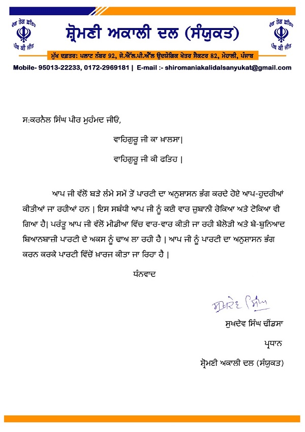 ਸ਼੍ਰੋਮਣੀ ਅਕਾਲੀ ਦਲ (ਸੰਯੁਕਤ) ਨੇ ਕਰਨੈਲ ਸਿੰਘ ਪੀਰ ਮੁਹੰਮਦ ਨੂੰ ਪਾਰਟੀ ‘ਚੋਂ ਕੀਤਾ ਖਾਰਜ