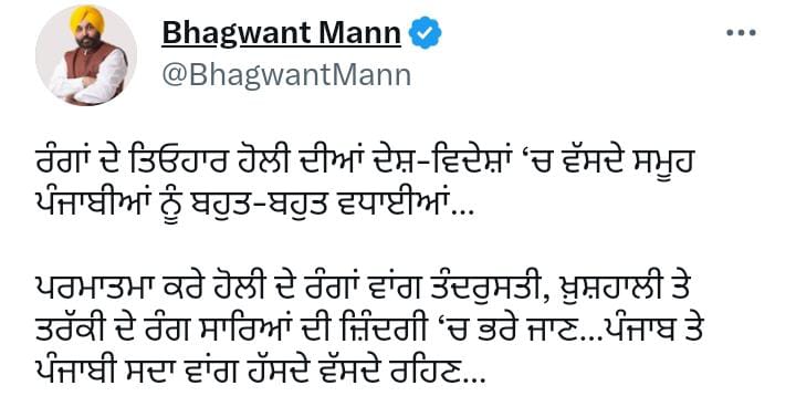ਪੰਜਾਬ ਦੇ ਮੁੱਖ ਮੰਤਰੀ ਭਗਵੰਤ ਮਾਨ ਨੇ ਟਵੀਟ ਕਰਕੇ ਸਾਰਿਆਂ ਨੂੰ ਹੋਲੀ ਦੀਆਂ ਸ਼ੁਭਕਾਮਨਾਵਾਂ ਦਿੱਤੀਆਂ ਹਨ। ਇਸ ਦੇ ਨਾਲ ਹੀ ਸੀਐਮ ਨੇ ਟਵੀਟ ਕਰਕੇ ਲਿਖਿਆ ਕਿ “ਰੰਗਾਂ ਦੇ ਤਿਓਹਾਰ ਹੋਲੀ ਦੀਆਂ ਦੇਸ਼-ਵਿਦੇਸ਼ਾਂ ‘ਚ ਵੱਸਦੇ ਸਮੂਹ ਪੰਜਾਬੀਆਂ ਨੂੰ ਬਹੁਤ-ਬਹੁਤ ਵਧਾਈਆਂ, ਪਰਮਾਤਮਾ ਕਰੇ ਹੋਲੀ ਦੇ ਰੰਗਾਂ ਵਾਂਗ ਤੰਦਰੁਸਤੀ, ਖ਼ੁਸ਼ਹਾਲੀ ਤੇ ਤਰੱਕੀ ਦੇ ਰੰਗ ਸਾਰਿਆਂ ਦੀ ਜ਼ਿੰਦਗੀ ‘ਚ ਭਰੇ ਜਾਣ…ਪੰਜਾਬ ਤੇ ਪੰਜਾਬੀ ਸਦਾ ਵਾਂਗ ਹੱਸਦੇ ਵੱਸਦੇ ਰਹਿਣ”