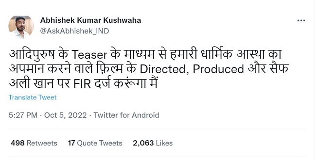 ਇਹ ਫਿਲਮ ਦੇਸ਼ ਵਿੱਚ ਨਫ਼ਰਤ ਲਿਆਵੇਗੀ, ਜੋ ਸਮਾਜ ਅਤੇ ਦੇਸ਼ ਲਈ ਬਹੁਤ ਘਾਤਕ ਹੈ। ਨੋਟਿਸ ‘ਚ ਇਹ ਵੀ ਲਿਖਿਆ ਗਿਆ, ‘ਕੀ ਤੁਸੀਂ ਇਹ ਫਿਲਮ ਇਸ ਲਈ ਬਣਾ ਰਹੇ ਹੋ ਕਿ ਤੁਸੀਂ ਹਿੰਦੂਆਂ ਦੀਆਂ ਭਾਵਨਾਵਾਂ ਨੂੰ ਠੇਸ ਪਹੁੰਚਾਈ ਹੋਵੇ? ਇਸ ਫਿਲਮ ਨੂੰ ਰਾਮਾਇਣ ਅਤੇ ਰਾਮਚਰਿਤਮਾਨਸ ਦੇ ਆਧਾਰ ‘ਤੇ ਬਣਾਓ। ਇਸ ਲਈ ਅਸੀਂ ਤੁਹਾਨੂੰ ਇਹ ਕਾਨੂੰਨੀ ਨੋਟਿਸ ਭੇਜ ਰਹੇ ਹਾਂ। ਤੁਸੀਂ ਜਨਤਕ ਤੌਰ ‘ਤੇ ਮੁਆਫੀ ਮੰਗੋ, ਨਹੀਂ ਤਾਂ 7 ਦਿਨਾਂ ਬਾਅਦ ਤੁਹਾਡੇ ਵਿਰੁੱਧ ਕਾਨੂੰਨੀ ਕਾਰਵਾਈ ਕੀਤੀ ਜਾਵੇਗੀ। ਅਜੇ ਤੱਕ ਨਿਰਦੇਸ਼ਕ ਨੇ ਇਸ ‘ਤੇ ਕੋਈ ਪ੍ਰਤੀਕਿਰਿਆ ਨਹੀਂ ਦਿੱਤੀ ਹੈ।