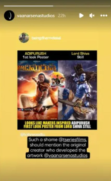 ਵਾਨਰ ਸੈਨਾ ਐਨੀਮੇਸ਼ਨ ਸਟੂਡੀਓਜ਼ ਨੇ ਦਾਅਵਾ ਕੀਤਾ ਹੈ ਕਿ ਫਿਲਮ ਆਦਿਪੁਰਸ਼ ਦਾ ਪੋਸਟਰ ਉਨ੍ਹਾਂ ਦੇ ਕੰਮ ਦੀ ਨਕਲ ਹੈ। ਟੀਜ਼ਰ ਦਾ ਫਰਸਟ ਲੁੱਕ ਪੋਸਟਰ ਅਤੇ ਕੁਝ ਸੀਨ ਉਸ ਦੇ ਕੰਮ ਤੋਂ ਕਾਪੀ ਕੀਤੇ ਗਏ ਹਨ। ਉਨ੍ਹਾਂ ਨੇ ਭਗਵਾਨ ਸ਼ਿਵ ਦੀ ਫੋਟੋ ਸ਼ੇਅਰ ਕਰਦੇ ਹੋਏ ਕਿਹਾ ਕਿ ਜਿਸ ਤਰ੍ਹਾਂ ਪ੍ਰਭਾਸ ਆਦਿਪੁਰਸ਼ ਟੀਜ਼ਰ ‘ਚ ਧਨੁਸ਼ ਲੈ ਕੇ ਖੜ੍ਹੇ ਹਨ, ਬਿਲਕੁਲ ਉਸੇ ਤਰ੍ਹਾਂ ਹੀ ਸ਼ਿਵ ਉਨ੍ਹਾਂ ਦੇ ਪੋਸਟਰ ‘ਚ ਖੜ੍ਹੇ ਹਨ। ਇੰਸਟਾਗ੍ਰਾਮ ‘ਤੇ ਪੋਸਟ ਸ਼ੇਅਰ ਕਰਦੇ ਹੋਏ ਸਟੂਡੀਓ ਨੇ ਦਾਅਵਾ ਕੀਤਾ ਹੈ ਕਿ ਆਦਿਪੁਰਸ਼ ਦਾ ਪੋਸਟਰ ਉਸ ਦੇ ਕੰਮ ਤੋਂ ਪ੍ਰੇਰਿਤ ਹੈ। ਪੋਸਟ ਨੇ ਲਿਖਿਆ, ‘ਇਹ ਬਹੁਤ ਨਿਰਾਸ਼ਾਜਨਕ ਹੈ ਕਿ ਸਾਡੇ ਕੰਮ ਦੀ ਇਸ ਤਰ੍ਹਾਂ ਨਕਲ ਕੀਤੀ ਜਾ ਰਹੀ ਹੈ। ਨਿਰਮਾਤਾਵਾਂ ਨੂੰ ਘੱਟੋ-ਘੱਟ ਅਸਲੀ ਸਿਰਜਣਹਾਰ ਦਾ ਨਾਂ ਦੇਣਾ ਚਾਹੀਦਾ ਹੈ।
