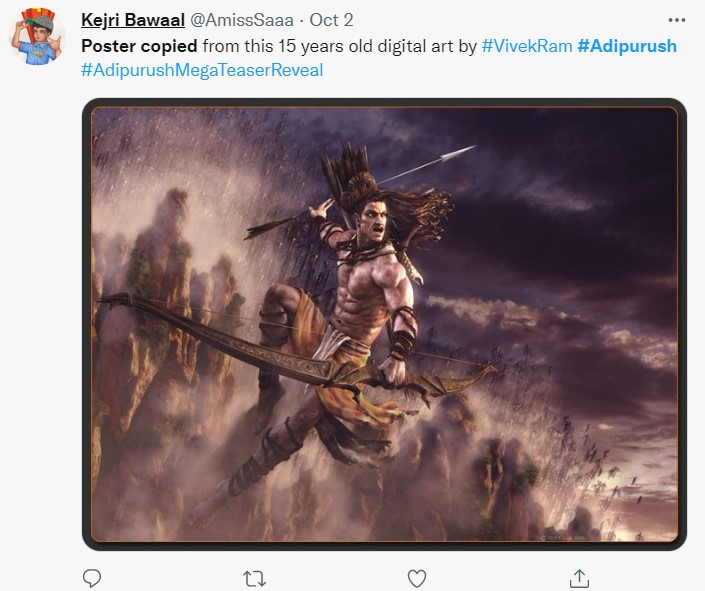 ਆਦਿਪੁਰਸ਼ ਦਾ ਟੀਜ਼ਰ ਪਹਿਲਾਂ ਹੀ ਵਿਵਾਦਾਂ ‘ਚ ਘਿਰਿਆ ਹੋਇਆ ਹੈ। ਐਨੀਮੇਸ਼ਨ ਸਟੂਡੀਓ ਦੇ ਇਲਜ਼ਾਮ ਤੋਂ ਬਾਅਦ ਹੁਣ ਯੂਜ਼ਰਸ ਮੇਕਰਸ ਨੂੰ ਵੀ ਖੂਬ ਟ੍ਰੋਲ ਕਰ ਰਹੇ ਹਨ। ਕਈਆਂ ਨੇ ਸਟੂਡੀਓ ਦੇ ਨਿਰਮਾਤਾ ਵਿਵੇਕ ਰਾਮ ਨੂੰ ਟੈਗ ਕਰਦੇ ਹੋਏ ਕਿਹਾ ਹੈ ਕਿ ਆਦਿਪੁਰਸ਼ ਨਿਰਮਾਤਾਵਾਂ ਨੇ ਉਸ ਦੇ ਪੋਸਟਰ ਦੀ ਨਕਲ ਕੀਤੀ ਹੈ।ਪ੍ਰਭਾਸ ‘ਆਦਿ ਪੁਰਸ਼’ ‘ਚ ਭਗਵਾਨ ਰਾਮ ਦੀ ਭੂਮਿਕਾ ‘ਚ ਨਜ਼ਰ ਆਉਣਗੇ। ਸੀਤਾ ਦੇ ਕਿਰਦਾਰ ‘ਚ ਕ੍ਰਿਤੀ ਸੈਨਨ ਜਾਨਕੀ ਨਾਂ ਦਾ ਕਿਰਦਾਰ ਨਿਭਾਏਗੀ। ਸੈਫ ਅਲੀ ਖਾਨ ਰਾਵਣ ਬਣ ਗਏ ਹਨ ਅਤੇ ਦੇਵਦੱਤ ਗਜਾਨਨ ਹਨੂੰਮਾਨ ਦੇ ਕਿਰਦਾਰ ‘ਚ ਨਜ਼ਰ ਆਉਣਗੇ। ਇਹ ਫਿਲਮ 12 ਜਨਵਰੀ 2023 ਨੂੰ ਰਿਲੀਜ਼ ਹੋਵੇਗੀ।