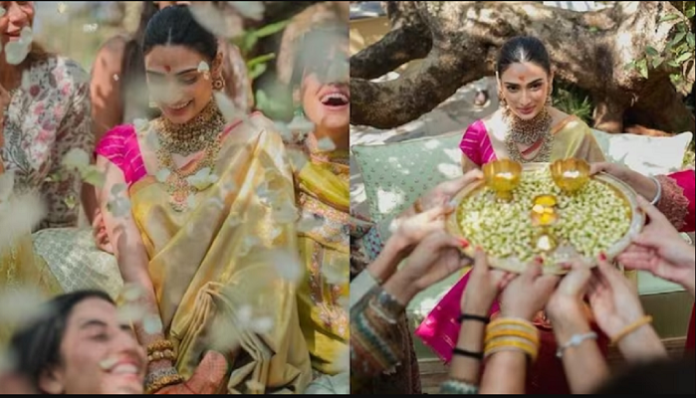 ਆਥੀਆ ਸ਼ੈੱਟੀ ਅਤੇ ਕੇਐਲ ਰਾਹੁਲ ਵਿਆਹ ਦੇ ਬੰਧਨ ਵਿੱਚ ਬੱਝ ਗਏ ਹਨ। ਹੁਣ ਹਾਲ ਹੀ ‘ਚ ਅਦਾਕਾਰਾ ਨੇ ਆਪਣੇ ਸੋਸ਼ਲ ਮੀਡੀਆ ਅਕਾਊਂਟ ‘ਤੇ ਵਿਆਹ ਤੋਂ ਪਹਿਲਾਂ ਦੀਆਂ ਤਸਵੀਰਾਂ ਸ਼ੇਅਰ ਕੀਤੀਆਂ ਹਨ। ਜਿਸ ‘ਚ ਅਦਾਕਾਰਾ ਬੇਹੱਦ ਖੂਬਸੂਰਤ ਲੱਗ ਰਹੀ ਹੈ। ਇਨ੍ਹਾਂ ਤਸਵੀਰਾਂ ‘ਚ ਆਥੀਆ ਹਰੇ ਰੰਗ ਦੀ ਸਾੜੀ ‘ਚ ਬੇਹੱਦ ਖੂਬਸੂਰਤ ਲੱਗ ਰਹੀ ਹੈ। ਇਸ ਦੇ ਨਾਲ ਹੀ ਉਨ੍ਹਾਂ ਦੇ ਪ੍ਰਸ਼ੰਸਕ ਵਿਆਹ ਦੀਆਂ ਰਸਮਾਂ ਦੌਰਾਨ ਲਈਆਂ ਗਈਆਂ ਇਨ੍ਹਾਂ ਤਸਵੀਰਾਂ ਨੂੰ ਦੇਖ ਕੇ ਕਾਫੀ ਖੁਸ਼ ਹਨ। ਹਾਲ ਹੀ ‘ਚ ਆਥੀਆ ਨੇ ਆਪਣੇ ਇੰਸਟਾਗ੍ਰਾਮ ਅਕਾਊਂਟ ‘ਤੇ ਵਿਆਹ ਤੋਂ ਪਹਿਲਾਂ ਦੀਆਂ ਤਸਵੀਰਾਂ ਸ਼ੇਅਰ ਕੀਤੀਆਂ ਹਨ। ਇਨ੍ਹਾਂ ਤਸਵੀਰਾਂ ‘ਚ ਅਭਿਨੇਤਰੀ ਚਮਕਦਾਰ ਸ਼ਾਕਾਹਾਰੀ ਰੰਗ ਦੀ ਸਾੜੀ ਅਤੇ ਸੁਨਹਿਰੀ ਗਹਿਣਿਆਂ ‘ਚ ਨਜ਼ਰ ਆ ਰਹੀ ਹੈ। ਉਸਨੇ ਆਪਣੇ ਵਾਲਾਂ ਵਿੱਚ ਜੂੜਾ ਬੰਨ੍ਹਿਆ ਹੋਇਆ ਹੈ।