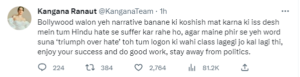 ਦਰਅਸਲ ‘ਪਠਾਨ’ ਦੀ ਸਫਲਤਾ ਤੋਂ ਬਾਅਦ ਬਾਲੀਵੁੱਡ ਦੇ ਬਾਦਸ਼ਾਹ ਸ਼ਾਹਰੁਖ ਖਾਨ ਦੇ ਪ੍ਰਸ਼ੰਸਕ ਲਗਾਤਾਰ ਸੋਸ਼ਲ ਮੀਡੀਆ ਰਾਹੀਂ ਖੁਸ਼ੀ ਦਾ ਇਜ਼ਹਾਰ ਕਰ ਰਹੇ ਹਨ। ਇਸ ਦੇ ਨਾਲ ਹੀ ਕਰਨ ਜੌਹਰ ਅਤੇ ਆਲੀਆ ਭੱਟ ਵਰਗੇ ਇੰਡਸਟਰੀ ਦੇ ਅਦਾਕਾਰ ਅਤੇ ਨਿਰਦੇਸ਼ਕ ਫਿਲਮ ਦੀ ਸਫਲਤਾ ਨੂੰ ‘ਨਫ਼ਰਤ ‘ਤੇ ਜਿੱਤ’ ਕਹਿ ਰਹੇ ਹਨ, ਜੋ ਕੰਗਨਾ ਨੂੰ ਰਾਸ ਨਹੀਂ ਆ ਰਿਹਾ । ਕੰਗਨਾ ਨੇ ਟਵੀਟ ਕੀਤਾ ਅਤੇ ਲਿਖਿਆ, ‘ਬਾਲੀਵੁੱਡ ਦੇ ਲੋਕੋ, ਇਹ ਬਿਰਤਾਂਤ ਬਣਾਉਣ ਦੀ ਕੋਸ਼ਿਸ਼ ਨਾ ਕਰੋ ਕਿ ਤੁਸੀਂ ਇਸ ਦੇਸ਼ ਵਿੱਚ ਹਿੰਦੂਆਂ ਦੀ ਨਫ਼ਰਤ ਤੋਂ ਪੀੜਤ ਹੋ, ਜੇਕਰ ਮੈਂ ‘ਨਫ਼ਰਤ ‘ਤੇ ਜਿੱਤ’ ਸ਼ਬਦ ਦੁਬਾਰਾ ਸੁਣਦੀ ਹਾਂ, ਤਾਂ ਤੁਸੀਂ ਕੱਲ੍ਹ ਵਰਗਾ ਮਹਿਸੂਸ ਕਰੋਗੇ। ਆਪਣੀ ਸਫਲਤਾ ਦਾ ਆਨੰਦ ਮਾਣੋ ਅਤੇ ਚੰਗੇ ਕੰਮ ਕਰੋ, ਰਾਜਨੀਤੀ ਤੋਂ ਦੂਰ ਰਹੋ।