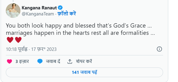 ਸ਼ੁੱਕਰਵਾਰ ਨੂੰ ਸਵਰਾ ਨੇ ਆਪਣੇ ਵਿਆਹ ਦੀਆਂ ਤਸਵੀਰਾਂ ਸ਼ੇਅਰ ਕੀਤੀਆਂ ਹਨ। ਇਸ ਦੌਰਾਨ ਉਸ ਨੇ ਲਾਲ ਰੰਗ ਦੀ ਸਾੜੀ ਪਾਈ ਹੋਈ ਸੀ। ਉਸਨੇ ਆਪਣੇ ਹੱਥਾਂ ‘ਤੇ ਮਹਿੰਦੀ ਲਗਾਈ ਹੋਈ ਸੀ ਅਤੇ ਗਹਿਣਿਆਂ ਦੇ ਨਾਮ ‘ਤੇ, ਉਸਨੇ ਆਪਣੇ ਗਲੇ ਵਿੱਚ ਇੱਕ ਲਾਈਟ ਸੈੱਟ, ਮੰਗਟਿਕਾ ਅਤੇ ਉਸਦੇ ਹੱਥਾਂ ਵਿੱਚ ਕੁਝ ਚੂੜੀਆਂ ਪਾਈਆਂ ਹੋਈਆਂ ਸਨ। ਸਵਰਾ ਦਾ ਸਧਾਰਨ ਅੰਦਾਜ਼ ਫੈਨਜ਼ ਨੂੰ ਕਾਫੀ ਪਸੰਦ ਆ ਰਿਹਾ ਹੈ। ਹੁਣ ਕੰਗਨਾ ਨੇ ਸਵਰਾ ਦੀਆਂ ਇਨ੍ਹਾਂ ਤਸਵੀਰਾਂ ‘ਤੇ ਕਮੈਂਟ ਕੀਤਾ ਹੈ। ਕੰਗਨਾ ਨੇ ਲਿਖਿਆ- ਤੁਸੀਂ ਦੋਵੇਂ ਖੁਸ਼ ਨਜ਼ਰ ਆ ਰਹੇ ਹੋ। ਦੱਸ ਦੇਈਏ ਕਿ ਸਵਰਾ ਅਤੇ ਕੰਗਨਾ ਫਿਲਮ ਤਨੂ ਵੈਡਸ ਮਨੂ ਵਿੱਚ ਇਕੱਠੇ ਕੰਮ ਕਰ ਚੁੱਕੇ ਹਨ। ਇਸ ਫਿਲਮ ‘ਚ ਉਹ ਕੰਗਨਾ ਦੀ ਦੋਸਤ ਬਣੀ ਹੋਈ ਹੈ। ਸਵਰਾ ਦੀਆਂ ਤਸਵੀਰਾਂ ‘ਤੇ ਕੰਗਨਾ ਦੇ ਟਵੀਟ ਤੋਂ ਬਾਅਦ ਇਕ ਯੂਜ਼ਰ ਨੇ ਲਿਖਿਆ- ਜ਼ਿੰਦਗੀ ਦਾ ਪਹਿਲਾ ਸਕਾਰਾਤਮਕ ਟਵੀਟ।