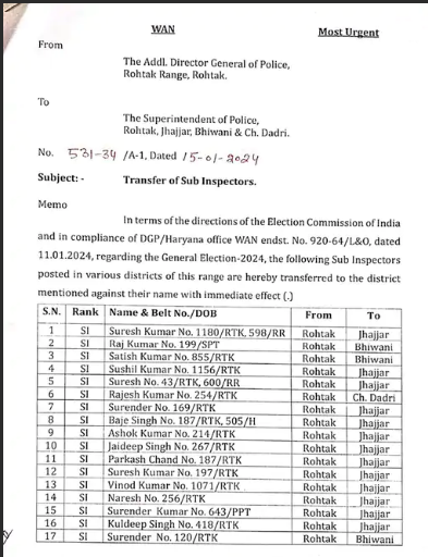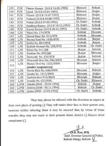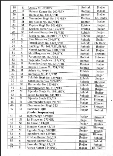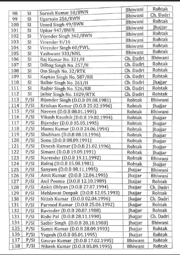ਦੱਸ ਦਈਏ ਕਿ ਟ੍ਰਾਂਸਫਰ ਸੂਚੀ ਵਿੱਚ ਚਾਰ ਸ਼੍ਰੇਣੀਆਂ ਹਨ। ਜਿਸ ਵਿੱਚ ਸਬ-ਇੰਸਪੈਕਟਰ (SI) 112, P/SI (ਜਿਨ੍ਹਾਂ ਨੂੰ ਸਿੱਧੇ ਸਬ-ਇੰਸਪੈਕਟਰ ਵਜੋਂ ਭਰਤੀ ਕੀਤਾ ਗਿਆ ਸੀ) 33, L/SI (ਮਹਿਲਾ ਸਬ ਇੰਸਪੈਕਟਰ) 14 ਅਤੇ L/PSI (ਜਿਨ੍ਹਾਂ ਨੂੰ ਸਿੱਧੇ ਸਬ-ਇੰਸਪੈਕਟਰ ਵਜੋਂ ਭਰਤੀ ਕੀਤਾ ਗਿਆ ਸੀ) 3 ਸ਼ਾਮਲ ਹਨ। ਤਬਾਦਲੇ ਦੀ ਸੂਚੀ ਵਿੱਚ ਸ਼ਾਮਲ 112 ਪੁਰਸ਼ ਸਬ ਇੰਸਪੈਕਟਰਾਂ (ਐਸਆਈ) ਵਿੱਚੋਂ 43 ਰੋਹਤਕ, 38 ਝੱਜਰ, 24 ਭਿਵਾਨੀ ਅਤੇ 7 ਚਰਖੀ ਦਾਦਰੀ ਜ਼ਿਲ੍ਹੇ ਦੇ ਹਨ।ਜਦੋਂ ਕਿ 33 ਪੀ/ਐਸਆਈ ਵਿੱਚੋਂ 12 ਰੋਹਤਕ, 12 ਝੱਜਰ, 6 ਭਿਵਾਨੀ ਅਤੇ 3 ਚਰਖੀ ਦਾਦਰੀ ਤੋਂ ਹਨ। ਤਬਾਦਲੇ ਦੀ ਸੂਚੀ ਵਿੱਚ ਸ਼ਾਮਲ 14 L/SI ਵਿੱਚੋਂ, 5 ਰੋਹਤਕ, 3 ਝੱਜਰ, 5 ਭਿਵਾਨੀ ਅਤੇ 1 ਚਰਖੀ ਦਾਦਰੀ ਤੋਂ ਹਨ। ਜਦੋਂ ਕਿ, 3 ਐਲ/ਪੀਐਸਆਈ ਵਿੱਚੋਂ, 2 ਰੋਹਤਕ ਅਤੇ ਇੱਕ ਚਰਖੀ ਦਾਦਰੀ ਤੋਂ ਹਨ।