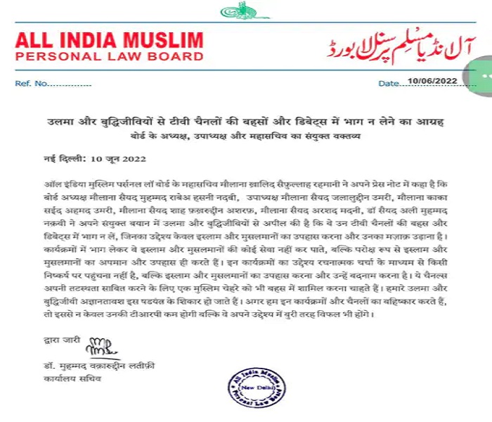 ਆਲ ਇੰਡੀਆ ਮੁਸਲਿਮ ਪਰਸਨਲ ਲਾਅ ਬੋਰਡ (ਏਆਈਐਮਪੀਐਲਬੀ) ਨੇ ਉਲੇਮਾ ਅਤੇ ਬੁੱਧੀਜੀਵੀਆਂ ਨੂੰ ਟੀਵੀ ਚੈਨਲਾਂ ‘ਤੇ ਬਹਿਸਾਂ ਵਿੱਚ ਹਿੱਸਾ ਨਾ ਲੈਣ ਦੀ ਅਪੀਲ ਕੀਤੀ ਹੈ। ਇਸ ਸਬੰਧੀ ਬੋਰਡ ਦੇ ਚੇਅਰਮੈਨ ਨੇ ਪੱਤਰ ਜਾਰੀ ਕੀਤਾ ਹੈ।