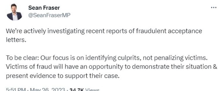 ਕੈਨੇਡਾ ਦੇ ਇਮੀਗ੍ਰੇਸ਼ਨ ਮੰਤਰੀ ਸਾਨ ਫਰੇਜ਼ਰ (Sean Fraser) ਦਾ ਇਕ ਵੱਡਾ ਬਿਆਨ ਸਾਹਮਣੇ ਆਇਆ ਹੈ ਜਿਸ ਨਾਲ ਕੈਨੇਡਾ ਗਏ ਵਿਦਿਆਰਥੀਆਂ ਨੂੰ ਵੱਡੀ ਰਾਹਤ ਮਿਲਣ ਦੀ ਉਮੀਦ ਹੈ। ਇਮੀਗ੍ਰੇਸ਼ਨ ਮੰਤਰੀ ਸਾਨ ਫਰੇਜ਼ਰ ਨੇ ਟਵੀਟ ਕਰਦਿਆਂ ਕਿਹਾ ਕਿ ਅਸੀਂ ਅੰਤਰਰਾਸ਼ਟਰੀ ਵਿਦਿਆਰਥੀ ਕੇਸਾਂ ‘ਚ ਲਾਏ ਜਾ ਰਹੇ ਜਾਅਲੀ ਦਾਖਲਾ ਪੱਤਰਾਂ ਦੀ ਜਾਂਚ ਕਰ ਰਹੇ ਹਾਂ। ਉਨ੍ਹਾਂ ਕਿਹਾ ਕਿ ਉਹ ਦੋਸ਼ੀਆਂ ਦੀ ਪਛਾਣ ਕਰਨ ‘ਤੇ ਧਿਆਨ ਕੇਂਦਰਿਤ ਕਰ ਰਹੇ ਹਨ, ਨਾ ਕਿ ਪੀੜਤਾਂ ਨੂੰ ਸਜ਼ਾ ਦੇਣ ਵੱਲ। ਉਨ੍ਹਾਂ ਇਹ ਵੀ ਕਿਹਾ ਕਿ ਅੰਤਰਰਾਸ਼ਟਰੀ ਵਿਦਿਆਰਥੀਆਂ ਦੀ ਕੈਨੇਡਾ ਨੂੰ ਬਹੁਤ ਦੇਣ ਹੈ ਤੇ ਅਸੀਂ ਠੱਗੀ ਦੇ ਸ਼ਿਕਾਰ ਵਿਦਿਅਰਥੀਆਂ ਦਾ ਇਕ-ਇਕ ਕੇਸ ਦੇਖ ਕੇ ਪੀੜਤਾਂ ਦੀ ਮਦਦ ਲਈ ਵਚਨਬੱਧ ਹਾਂ। ਇਸ ਘੁਟਾਲੇ ਦੇ ਪੀੜਤਾਂ ਨੂੰ ਆਪਣੇ ਹਾਲਾਤ ਦੱਸਣ ਤੇ ਆਪਣੇ ਕੇਸ ਵਿਚ ਸਬੂਤ ਪੇਸ਼ ਕਰਨ ਦਾ ਮੌਕਾ ਦਿੱਤਾ ਜਾਵੇਗਾ।