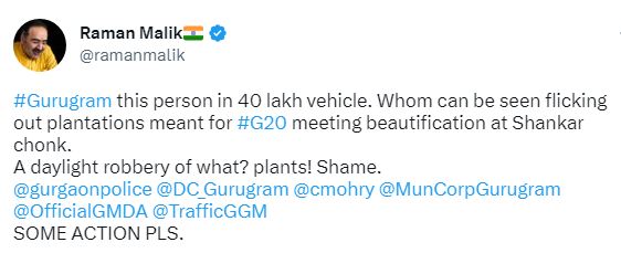 ਗੁਰੂਗ੍ਰਾਮ ‘ਚ ਜੀ-20 ਸੰਮੇਲਨ ਦੀਆਂ ਤਿਆਰੀਆਂ ਜਿਥੇ ਲੰਬੇ ਸਮੇਂ ਤੋਂ ਜ਼ੋਰਾਂ-ਸ਼ੋਰਾ ‘ਤੇ ਚੱਲ ਰਹੀਆਂ ਹਨ ਓਥੇ ਹੀ ਗੁਰੂਗ੍ਰਾਮ ‘ਚ ਅੱਜ 40 ਲੱਖ ਰੁਪਏ ਦੀ ਕਾਰ ‘ਚ ਆਏ ਚੋਰਾਂ ਨੇ ਚੌਰਾਹੇ ‘ਤੇ ਸਜਾਏ 400 ਰੁਪਏ ਦੇ ਪੌਦੇ ਚੋਰੀ ਕਰ ਲਏ। ਜੀ-20 ਸੰਮੇਲਨ ਲਈ ਸ਼ਹਿਰ ਨੂੰ ਸਜਾਉਣ ਲਈ ਇਨ੍ਹਾਂ ਪੌਦਿਆਂ ਦੇ ਗਮਲੇ ਰੱਖੇ ਗਏ ਸਨ। ਚੋਰਾਂ ਦੀ ਲਗਜ਼ਰੀ ਕਾਰ ਦਾ ਨੰਬਰ ਵੀ ਵੀ.ਆਈ.ਪੀ ਹੈ। ਚੋਰੀ ਦੀ ਵੀਡੀਓ ਵਾਇਰਲ ਹੋਣ ਤੋਂ ਬਾਅਦ ਪ੍ਰਸ਼ਾਸਨ ਨੇ ਪੁਲਿਸ ਕੋਲ ਸ਼ਿਕਾਇਤ ਦਰਜ ਕਰਵਾਈ।