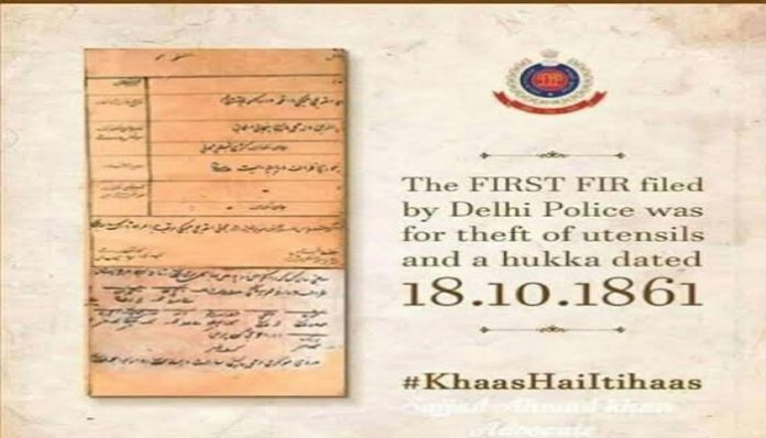 ਦੱਸਣਯੋਗ ਹੈ ਕਿ ਭਾਰਤ ਵਿੱਚ ਪਹਿਲੀ ਐਫਆਈਆਰ ਕਿਤੇ ਹੋਰ ਨਹੀਂ ਬਲਕਿ ਰਾਜਧਾਨੀ ਦਿੱਲੀ ਵਿੱਚ ਹੀ ਦਰਜ ਕੀਤੀ ਗਈ ਸੀ। ਇਹ ਰਿਪੋਰਟ ਚੋਰੀ ਦੀ ਘਟਨਾ ਸਬੰਧੀ ਦਰਜ ਕਰਵਾਈ ਗਈ ਸੀ। ਤਾਰੀਖ ਸੀ- 18 ਅਕਤੂਬਰ 1861। ਦਿੱਲੀ ਪੁਲਿਸ ਨੇ 24 ਅਗਸਤ 2017 ਨੂੰ ਆਪਣੇ ਟਵਿਟਰ ਹੈਂਡਲ ਤੋਂ ਟਵੀਟ ਕਰਕੇ ਇਹ ਜਾਣਕਾਰੀ ਦਿੱਤੀ ਸੀ। ਇਹ ਐਫਆਈਆਰ ਉਰਦੂ ਵਿੱਚ ਲਿਖੀ ਗਈ ਸੀ।ਦਿੱਲੀ ਪੁਲਿਸ ਨੇ ‘ਖ਼ਾਸ ਹੈ ਇਤਿਹਾਸ’ ਟੈਗਲਾਈਨ ਨਾਲ ਐਫਆਈਆਰ ਦੀ ਇੱਕ ਕਾਪੀ ਟਵੀਟ ਕੀਤੀ ਸੀ। ਇਸ ਐਫਆਈਆਰ ਦੇ ਨਾਲ ਦਿੱਲੀ ਪੁਲਿਸ ਨੇ ਚੋਰੀ ਹੋਏ ਸਮਾਨ ਦਾ ਵੀ ਜ਼ਿਕਰ ਕੀਤਾ ਹੈ।