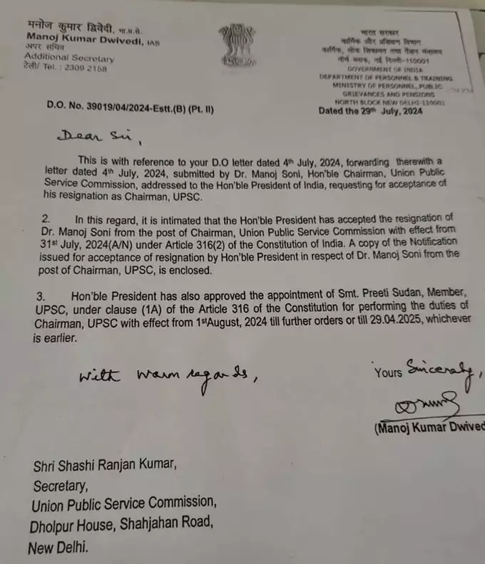 ਜ਼ਿਕਰਯੋਗ ਹੈ ਕਿ ਸਿਖਿਆਰਥੀ ਆਈਏਐਸ ਪੂਜਾ ਖੇਡਕਰ ਵਿਵਾਦ ਦੌਰਾਨ ਯੂਪੀਐਸਸੀ ਦੇ ਸਾਬਕਾ ਚੇਅਰਮੈਨ ਮਨੋਜ ਸੋਨੀ ਦੇ ਅਸਤੀਫ਼ੇ ਤੋਂ ਬਾਅਦ ਇਹ ਅਹੁਦਾ ਖਾਲੀ ਹੋ ਗਿਆ ਸੀ।ਮਹੇਸ਼ ਸੋਨੀ ਨੇ ਨਿੱਜੀ ਕਾਰਨਾਂ ਕਰਕੇ ਅਸਤੀਫਾ ਦੇ ਦਿੱਤਾ ਸੀ।