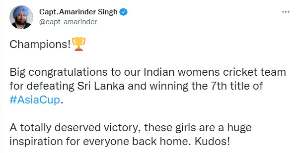 ਭਾਰਤ ਨੇ ਅੱਜ ਸੱਤਵੀਂ ਵਾਰ ਮਹਿਲਾ ਏਸ਼ੀਆ ਕੱਪ ਦਾ ਖਿਤਾਬ ਜਿੱਤਿਆ ਹੈ। ਪੰਜਾਬ ਦੇ ਸਾਬਕਾ ਮੁੱਖ ਮੰਤਰੀ ਕੈਪਟਨ ਅਮਰਿੰਦਰ ਸਿੰਘ ਨੇ ਭਾਰਤੀ ਮਹਿਲਾ ਕ੍ਰਿਕਟ ਟੀਮ ਨੂੰ ਏਸ਼ੀਆ ਕੱਪ ਖਿਤਾਬ ਜਿੱਤਣ ‘ਤੇ ਵਧਾਈ ਦਿੱਤੀ ਹੈ ਉਨ੍ਹਾਂ ਟਵੀਟ ਕੀਤਾ ਕਿ “ਸਾਡੀ ਭਾਰਤੀ ਮਹਿਲਾ ਕ੍ਰਿਕਟ ਟੀਮ ਨੂੰ ਸੱਤਵੀਂ ਵਾਰ ਏਸ਼ੀਆ ਕੱਪ ਦਾ ਖਿਤਾਬ ਜਿੱਤਣ ਲਈ ਬਹੁਤ-ਬਹੁਤ ਵਧਾਈਆਂ। ਇਸ ਜਿੱਤ ਦੀ ਟੀਮ ਪੂਰੀ ਤਰ੍ਹਾਂ ਹੱਕਦਾਰ ਸੀ, ਇਹ ਕੁੜੀਆਂ ਹਰੇਕ ਲਈ ਇੱਕ ਪ੍ਰੇਰਨਾਸ੍ਰੋਤ ਹਨ”