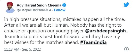 ਅਰਸ਼ਦੀਪ ਦੇ ਬਚਾਅ ਵਿੱਚ ਵਿੱਤ ਮੰਤਰੀ ਹਰਪਾਲ ਸਿੰਘ ਚੀਮਾ ਨੇ ਟਵੀਟ ਕੀਤਾ ਕਿ “ਉੱਚ ਦਬਾਅ ਵਾਲੀਆਂ ਸਥਿਤੀਆਂ ਵਿੱਚ ਗਲਤੀਆਂ ਹੋ ਜਾਂਦੀਆਂ ਹਨ। ਆਖ਼ਰਕਾਰ ਅਸੀਂ ਸਾਰੇ ਇਨਸਾਨ ਹਾਂ। ਕਿਸੇ ਨੂੰ ਵੀ ਸਾਡੇ ਨੌਜਵਾਨ ਖਿਡਾਰੀ ਅਰਸ਼ਦੀਪ ਸਿੰਘ ਦੀ ਆਲੋਚਨਾ ਜਾਂ ਸਵਾਲ ਕਰਨ ਦਾ ਅਧਿਕਾਰ ਨਹੀਂ ਹੈ। ਟੀਮ ਇੰਡੀਆ ਨੇ ਆਪਣਾ ਸਰਵਸ਼੍ਰੇਸ਼ਠ ਪ੍ਰਦਰਸ਼ਨ ਕੀਤਾ ਅਤੇ ਮੈਂ ਉਨ੍ਹਾਂ ਨੂੰ ਆਉਣ ਵਾਲੇ ਮੈਚਾਂ ਲਈ ਸ਼ੁਭਕਾਮਨਾਵਾਂ ਦਿੰਦਾ ਹਾਂ।”