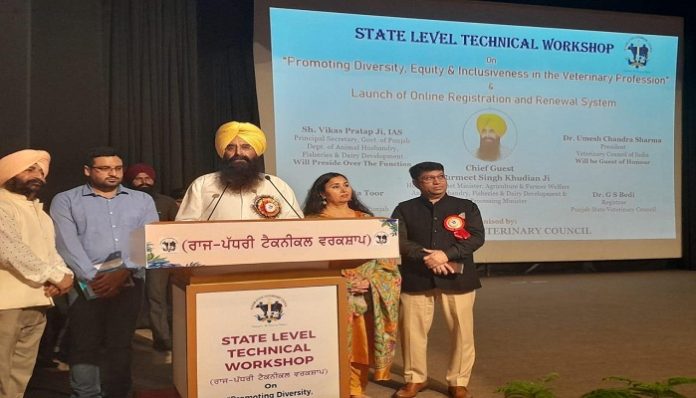 ਐਸ.ਏ.ਐਸ ਨਗਰ/ਖਰੜ, 28 ਸਤੰਬਰ 2023 (ਬਲਜੀਤ ਮਰਵਾਹਾ) : ਸਿਹਤ ਵਿਭਾਗ ਵਿੱਚ ਪੰਜਾਬ ਵੈਟਰਨਰੀ ਡਾਕਟਰਾਂ ਦੀ ਤਨਖਾਹ ਵਿੱਚ ਅਸਮਾਨਤਾ ਦਾ ਮੁੱਦਾ ਜਲਦੀ ਹੀ ਸਕਾਰਾਤਮਕ ਢੰਗ ਨਾਲ ਹੱਲ ਕੀਤਾ ਜਾਵੇਗਾ। ਇਸ ਗੱਲ ਦਾ ਐਲਾਨ ਪੰਜਾਬ ਦੇ ਪਸ਼ੂ ਪਾਲਣ, ਮੱਛੀ ਪਾਲਣ ਅਤੇ ਡੇਅਰੀ ਵਿਕਾਸ ਮੰਤਰੀ ਸ੍ਰੀ ਗੁਰਮੀਤ ਸਿੰਘ ਖੁੱਡੀਆਂ ਨੇ ਅੱਜ ਇੱਥੇ ਪੰਜਾਬ ਰਾਜ ਵੈਟਰਨਰੀ ਕੌਂਸਲ ਵੱਲੋਂ ਪਸ਼ੂ ਪਾਲਣ ਵਿਭਾਗ ਦੇ ਸਹਿਯੋਗ ਨਾਲ ਕਰਵਾਏ ਗਏ ‘ਵੈਟਰਨਰੀ ਪੇਸ਼ੇ ਵਿੱਚ ਵਿਭਿੰਨਤਾ, ਸਮਾਨਤਾ ਅਤੇ ਸ਼ਮੂਲੀਅਤ ਨੂੰ ਉਤਸ਼ਾਹਿਤ ਕਰਨਾ’ ਵਿਸ਼ੇ ’ਤੇ ਰਾਜ ਪੱਧਰੀ ਸੈਮੀਨਾਰ ਦਾ ਉਦਘਾਟਨ ਕਰਨ ਉਪਰੰਤ ਕੀਤਾ।
